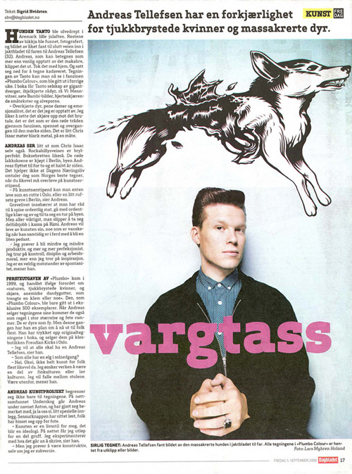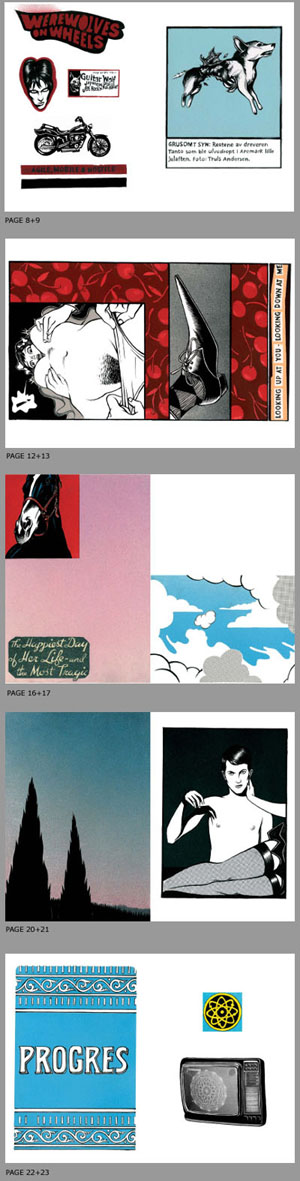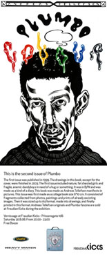 ------------------------------------------------- noCUBE 006 PLUMBO COLOUR by Andreas Tellefsen (NO) Release: fruehsorge - Berlin, 28 June 2008 Edition: 500 Pages: 24 pages Dimensions: 14,8 x 21 cm Process: Offset-printed, Colour Price 20 EUR + shipping ------------------------------------------------- "This is the second issue of Plumbo. _ The first issue was published in 1999. The drawings in this book, except for the cover, were finished in 2003. The first issue included nature, fat-chested girls and fragile, anemic dandyboys in need of a hug or something. It was in B/W and was made as a kind of a diary. This book was made as an Andreas Tellefsen manifesto in pictures. _ This issue was first made as a collage book size 6×10 cm. It consisted of fragments collected from photos, paintings and prints of already existing images. Then it was sized up to A4 format, made into drawings, and finally printed in this format. _ Enjoy." ![]() ------------------------------------------------- ![]() --- _ ![]() PAGE 16+17 ![]() FRONT PAGE ------------------------------------------------- _ _Dagbladet/Fredag 5 Sept 2008 - Vargtass _ ![]() D2/Dagens Næringsliv - Plumbo i A4 RELEASE _Release: Freudian Kicks - Oslo, 30 August 2008 _Pitures here (Oslo Nights) and here (André Gali). _ ![]() |