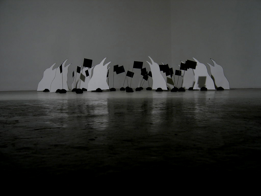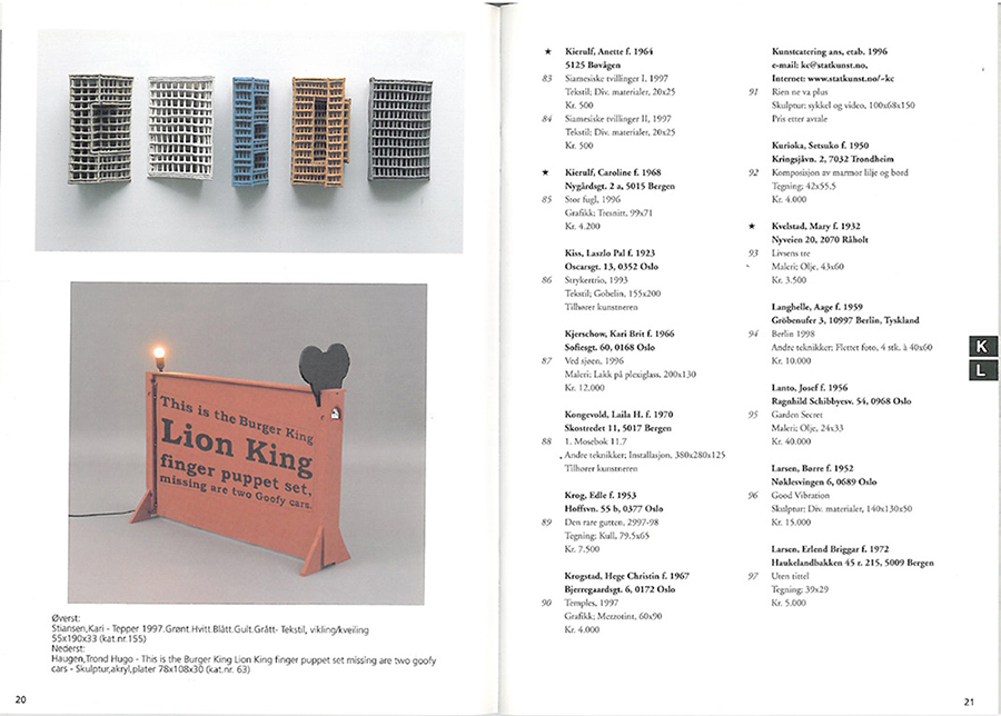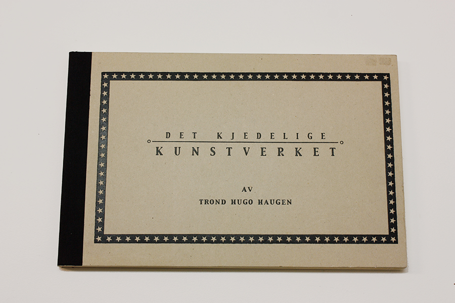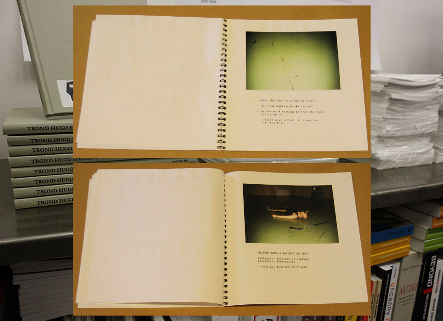 ![]() ![]() This May Take Several Minutes, 2006 Installation, size variable, Stop Motion Animation on 5 monitors, MDF boards. Installation view from the exhibition This May Take Several Minutes at Gallery Pictura, Lund, Sweden NOV 2006. https://vimeo.com/38906402 Bunker H612(a), H611, H612(b), 2003 Drawings, ink and pencil on paper Installation view from the exhibition Kabusa Invited, Kabusa Konsthall, Köpingebro 2006. ![]() ![]() Field #1-8, 2002-2006 Installation, size variable, high 4 cm, plaster. Exhibited in Trondheim, Oslo, Stavanger, Malmö and Köpingebro. ![]() In This City, 2006 Site-spesific drawing, acryl and markes on canves. Installation view from the exhibition After You´re Dead, You Won´t Even Know It, Gallery Rostrum, Malmö, JAN 2006. Untitled (Flags), 2006 Site-spesific installation. Installation view from the exhibition After You´re Dead, You Won´t Even Know It, Gallery Rostrum, Malmö, JAN 2006. ![]() Untitled (Wings), 2005 Drawings, 72x104 cm x 2, ink on paper. ![]() Untitled (Hanging Man), 2005 Drawings, 72x104 cm, ink on paper. Book D by Trond Hugo Haugen (NO), noCUBE 003, 2005 Book design: Trond Hugo Haugen Released: Tegnerforbundet, Oslo, 2005 Edition: 250 Pages: 64 Dimensions: 21,5x23 cm Published by: www.nocube.no The Next Room, Book D, Apparatus, 2005 Installation, artists books, drawings. Installation view from the exhibition The Next Room, Tegnerforbundet, Oslo, NOV 2005. The Days After Tomorrow - Underworld or Wonderland Catalogue, 2005 Design: Trond Hugo Haugen Released: Tegnerforbundet, Oslo, NOV 2005 Edition: 500 Catalog Sketches, 2005. ![]() Installation view from the exhibition Presentation, CirkulationsCentralen, 2005. Drawings for Book D, 2003 Series of drawings, ink om paper. Installation view from the exhibition Presentation, CirkulationsCentralen, 2005. Lack of Soul by Trond Hugo Haugen (NO), noCUBE 002, 2003 Book design: Trond Hugo Haugen Released: 2003 Edition: 200 Published by: www.nocube.no The Boring Work Of Art by Trond Hugo Haugen (NO), noCUBE 001, 2002 Book design: Trond Hugo Haugen Released: Trondheim Art Museum, 2002 Edition: 250 Published by: www.nocube.no They Remind Us, 2000 Studio work from The Academy of Fine Art, Trondheim ![]() Those Sick Fucks by Trond Hugo Haugen (NO), noCUBE 000, 1998 Book design: Trond Hugo Haugen Released: The Academy of Fine Art, Trondheim, 1998 Edition: 15 Published by: www.nocube.no ![]() This is The Burger King Lion King finger puppet set, missing are two Goofy cars, 1998 Sculpture, 78x103x30 cm. Catalog: The Autumn Exhibition/National Art Exhibition, Kunstnernes Hus, Oslo |