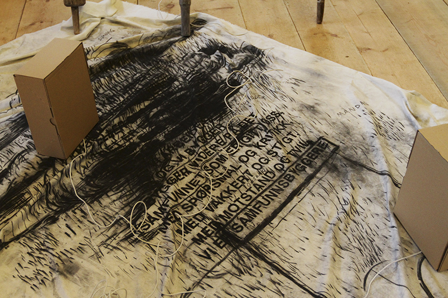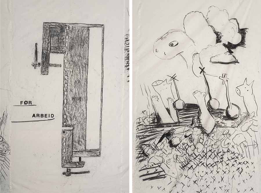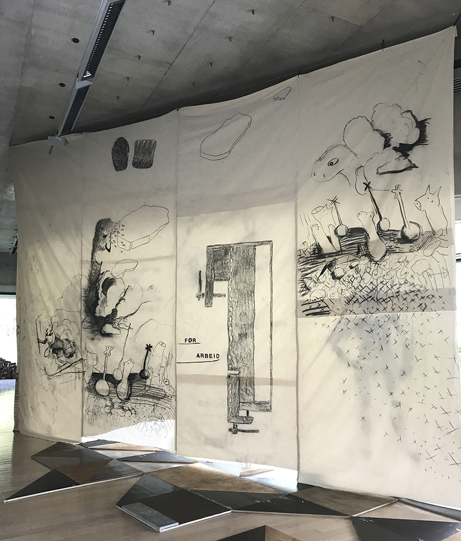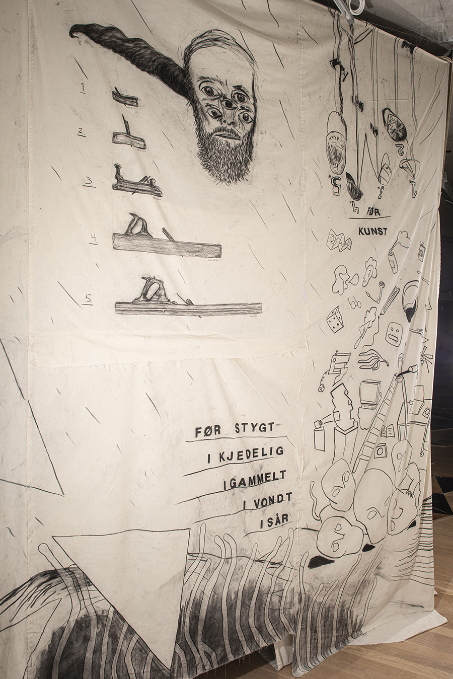 Charcoal on unbleached cotton canves, stop-motions animation, five old boat oars from Averøya.