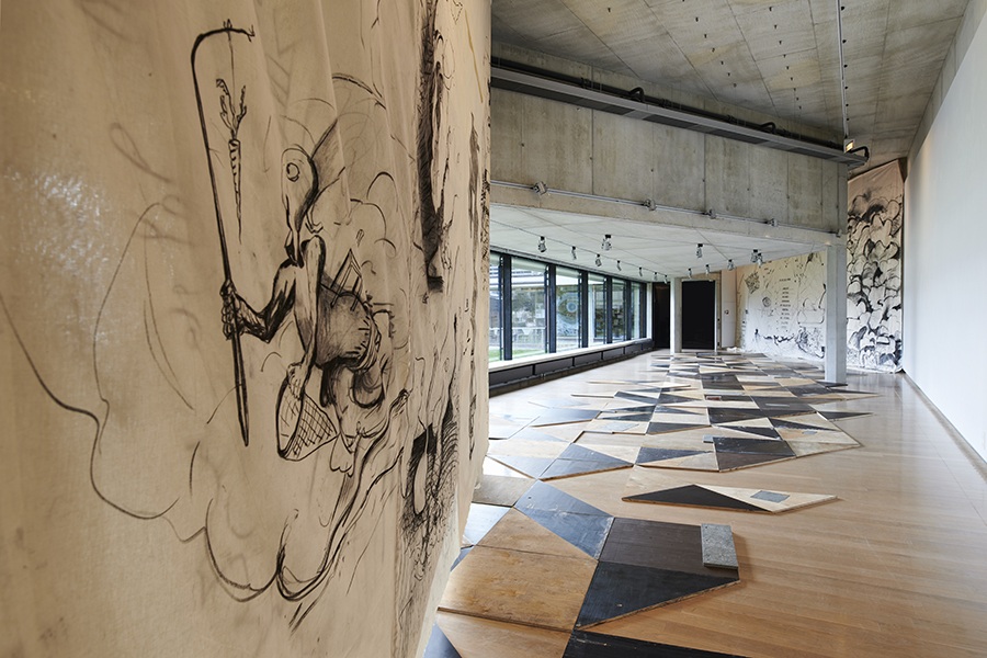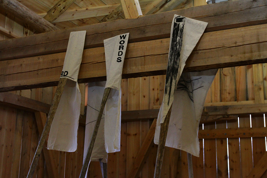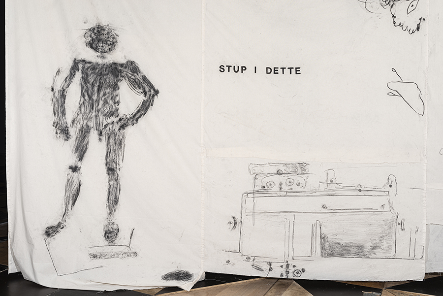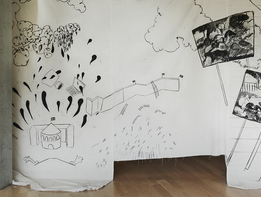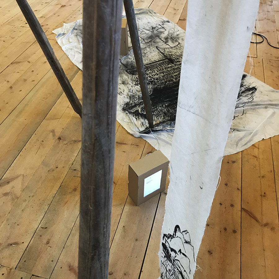 Charcoal on unbleached cotton canves, stop-motions animation, five old boat oars from Averøya.