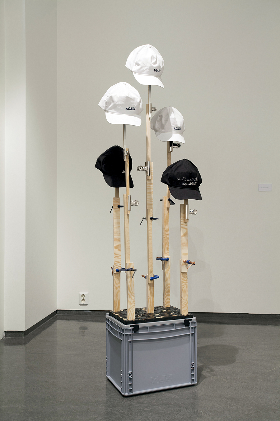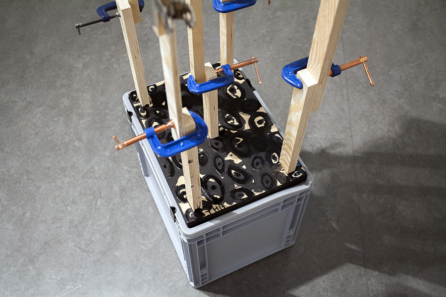 Wood, clamps/clips, paint, varnish, AUER grey plastic box 39 x 29,5 cm, height approx 175 cm.