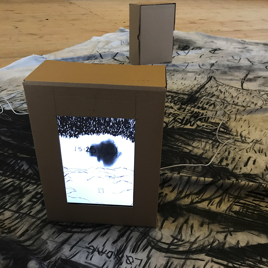 Charcoal on unbleached cotton canvas and charcoal and soured milk on glass