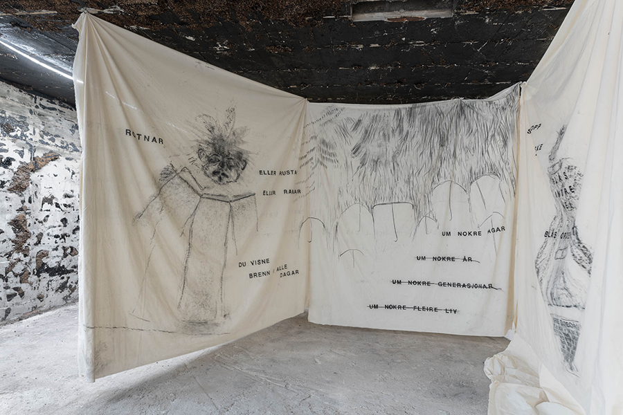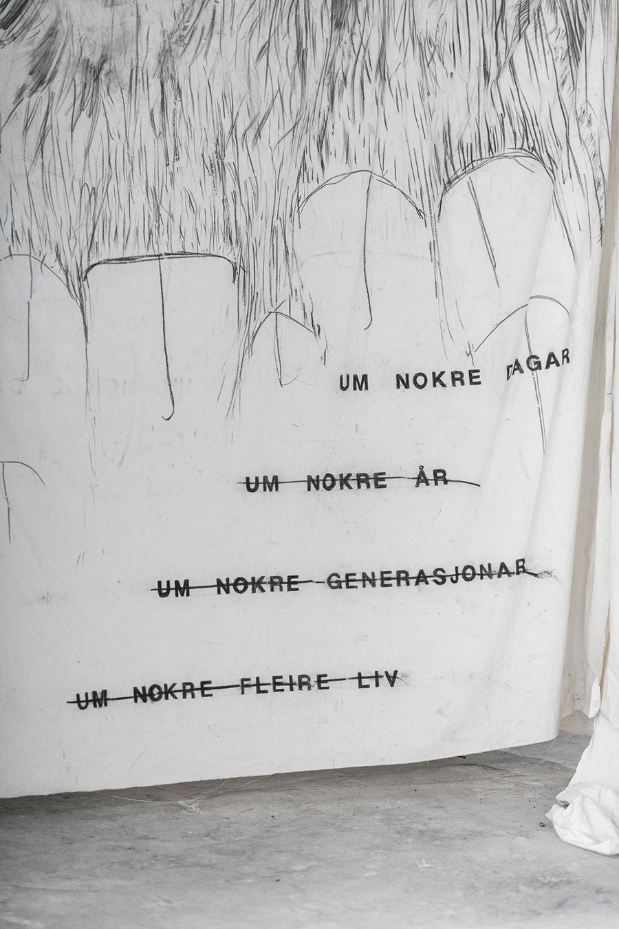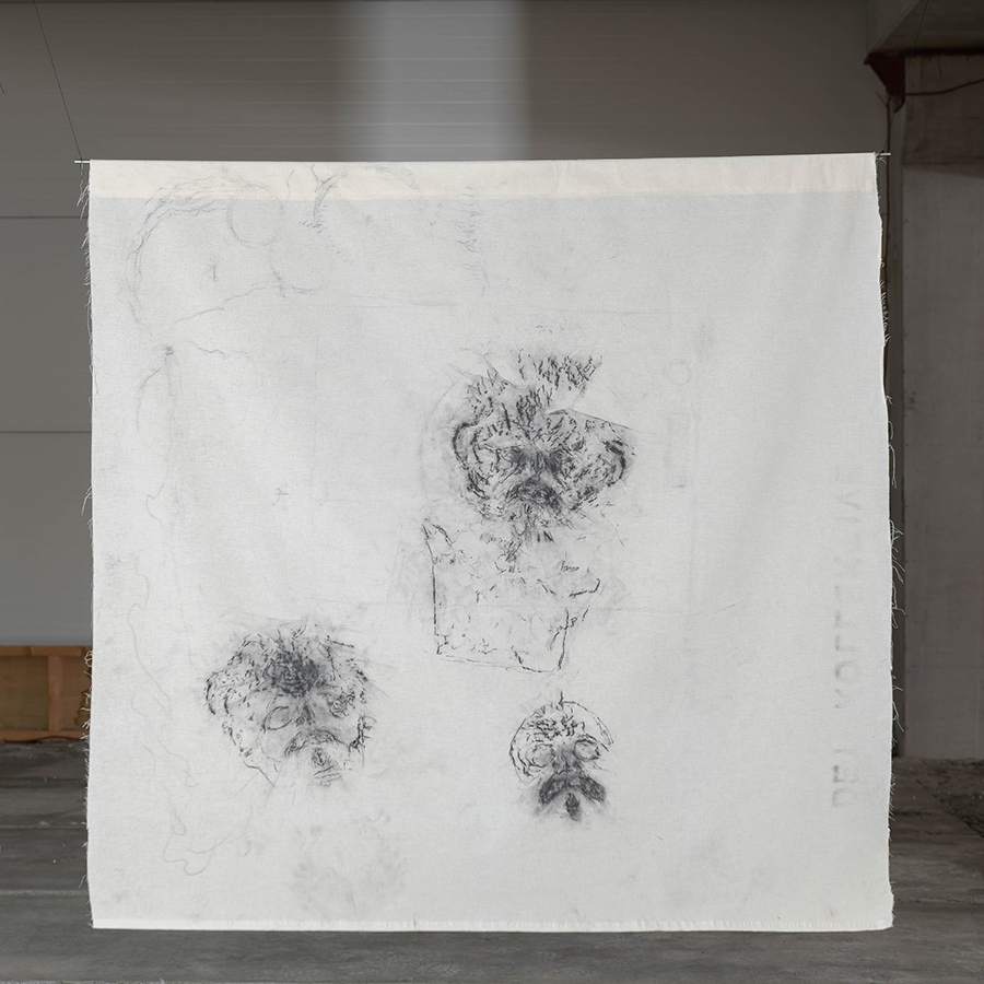 With Arnes ansikter (157x161 cm) and Hulda Garborg (165x106 cm), both 2024, charcoal on unbleached cotton canvas.