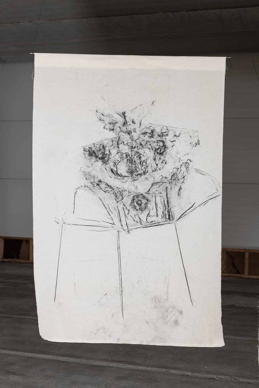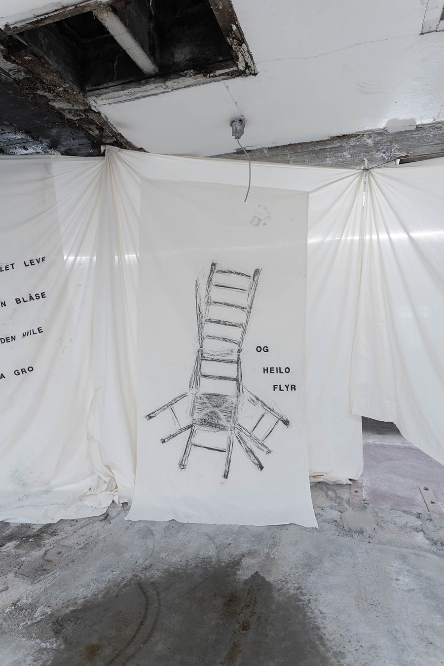 Charcoal, unbleached cotton canvas, wood, cardboard, colour print and three school chairs.