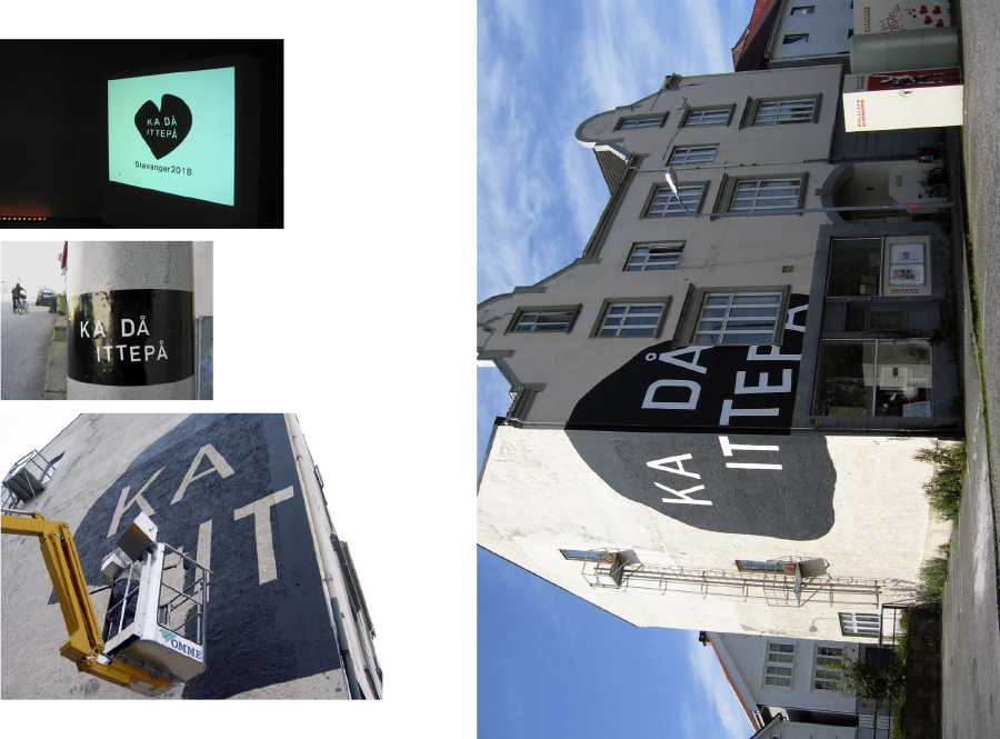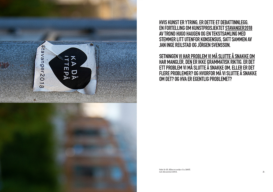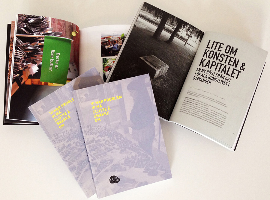 The publication Vi har problem vi må slutte å snakke om about the artproject STAVANGER2018 / KA DÅ ITTEPÅ was launched in 2015 with texts by Johan Harstad, Geir Sverre Braut, Ine Fintland, Hans E. Voktor, Arild Rein, Nils Henrik Asheim, David Karlsson, Gabriel Byström, Geir Haraldseth, Jörgen Svensson, Jan Inge Reilstad og Trond Hugo Haugen.