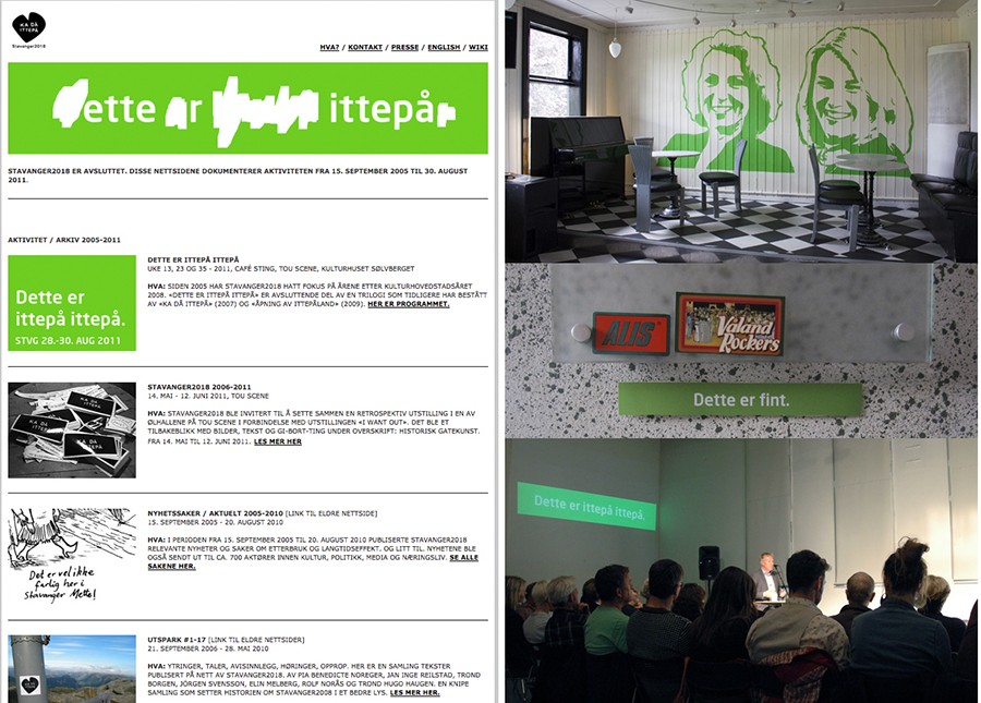 The fifth and last phase (2011) was the program DETTE ER ITTEPÅ ITTEPÅ (This is after afterwards) in connection med the local election in 2011, just a few weeks after July 22nd. This was the first election after the European Capital of Culture-years and Stavanger elected a new mayor after sixteen years.